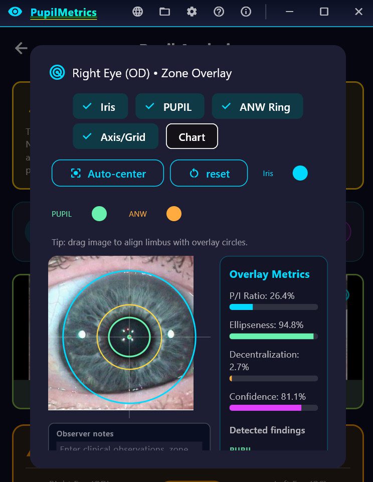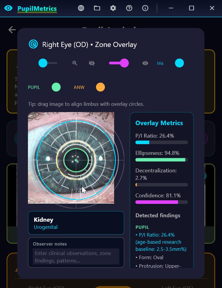 The zone map is available as a live polar overlay directly on the iris photo in the Results screen. When **Show zone overlay** is enabled (Settings → §8.3):