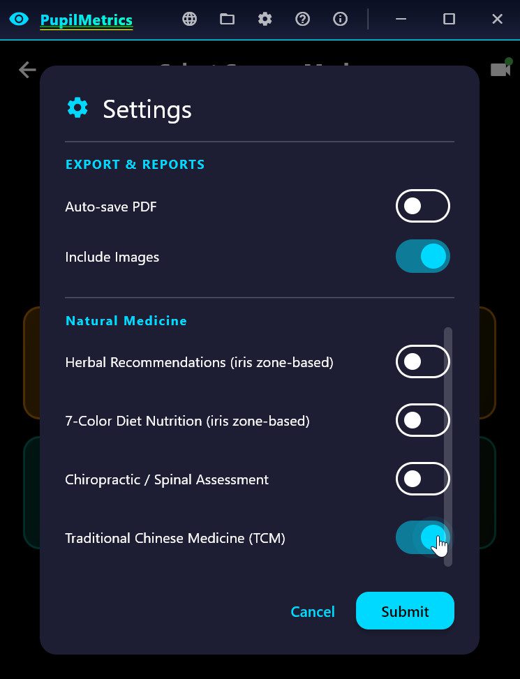 Toggle any module on, then run a scan. If the analysis finds qualifying iris zone findings, the corresponding panel appears as a tab (or section) on the results screen and is appended to the PDF report.