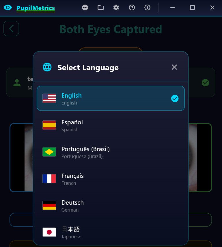 The language preference is remembered between sessions. The PDF report follows the active language at export time.