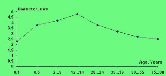 This curve illustrates age-related changes in pupil diameter.